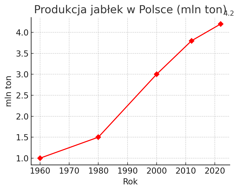 Produkcja jabłek w Polsce (mln ton) – dynamiczny wzrost od lat 90. Wykres ilustruje imponujące tempo wzrostu: z około 1,5 mln ton rocznie (średnio w latach 1960–1990) do 3–4 mln ton obecnie. Rekordowe zbiory odnotowano w roku 2018 – szacowane na ponad 4 mln ton, choć oficjalnie ujęty rekord to 3,8 mln ton w 2012. Tak wysoka produkcja dała Polsce trwałe pierwsze miejsce w Europie oraz czwarte na świecie (po Chinach, USA i Turcji). Co istotne, około połowa krajowych jabłek trafia na eksport – zarówno jako świeże owoce, jak i w postaci koncentratu soku jabłkowego. Polska stała się także światowym liderem eksportu zagęszczonego soku jabłkowego.