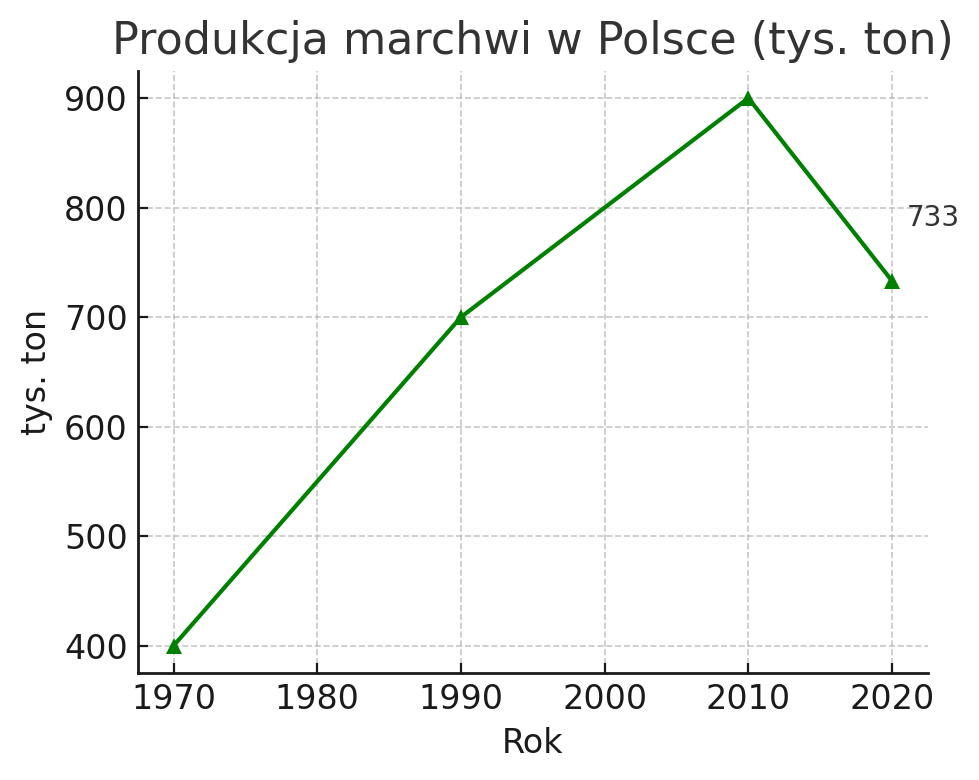 Marchew to dobry przykład tych przemian. Kiedyś była uprawiana głównie w przydomowych ogródkach na potrzeby lokalne, natomiast dziś Polska jest trzecim producentem marchwi w UE (poz. 6. na świecie), a większość towarowej marchwi pochodzi z wyspecjalizowanych regionów (np. Kujawy, Wielkopolska). Średni plon marchwi wzrósł z ok. 20 t/ha w 1970 r. do ponad 30 t/ha obecnie, co wraz z umiarkowanym zwiększeniem areału pozwoliło podwoić zbiory.