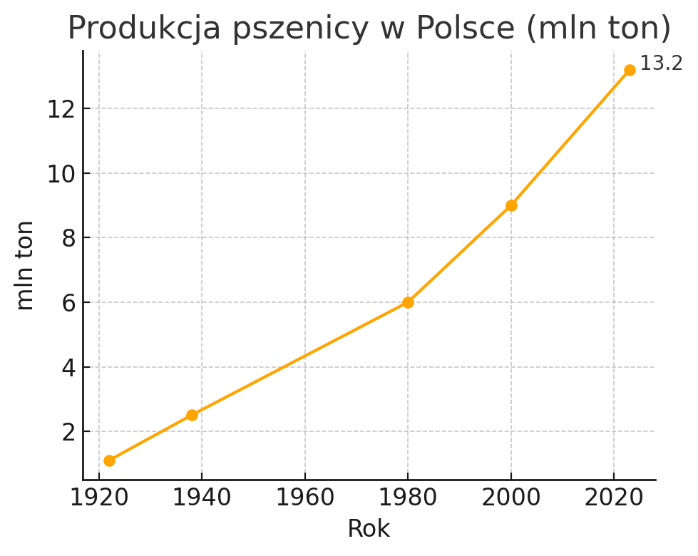 Produkcja pszenicy w Polsce w wybranych latach ostatniego stulecia (mln ton). Na początku niepodległości głównym zbożem w Polsce było żyto – w sezonie 1921/22 obsiano nim 4,5 mln ha pól, podczas gdy pszenica z areałem ~1 mln ha zajmowała dopiero czwarte miejsce. Plony były wówczas bardzo niskie – ok. 11 dt/ha dla pszenicy (czyli 1,1 t/ha). Oznaczało to zbiory pszenicy rzędu zaledwie ~1–2 mln ton rocznie (przed II wojną światową). Dla porównania, obecnie pszenica wysunęła się na pozycję dominującą w strukturze zasiewów zbóż i daje wielokrotnie wyższe plony. W 2017 r. przeciętny plon pszenicy wyniósł 48,8 dt/ha, czyli o 77% więcej niż w 1922 r.. Dzięki temu oraz powiększeniu areału upraw (do ok. 2,3 mln ha pszenicy ozimej i 0,2 mln ha jarej w 2023 r.) zbiory pszenicy osiągają obecnie ponad 12–13 mln ton rocznie – a więc kilkukrotnie więcej niż przed stu laty. W efekcie pszenica zastąpiła żyto jako najważniejsze polskie zboże chlebowe.