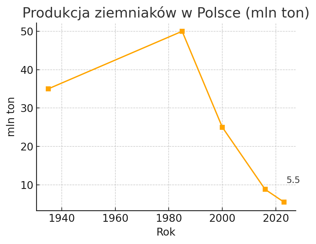 Produkcja ziemniaków w Polsce (mln ton) – gwałtowny spadek od lat 80. W pierwszych dekadach XX wieku ziemniaki były absolutną podstawą wyżywienia i paszą dla zwierząt, co odzwierciedlał olbrzymi areał ich upraw. Tuż po odzyskaniu niepodległości sadzono je na 2,2 mln ha, co stanowiło około 12% gruntów ornych kraju. Przed II wojną światową Polska zbierała rocznie ok. 25–35 mln ton ziemniaków. Po wojnie znaczenie ziemniaka jeszcze wzrosło – w drugiej połowie XX w. Polska przez długi czas była drugim producentem ziemniaków na świecie (po ZSRR). W latach 1963–1992 utrzymywaliśmy drugie miejsce w Europie z roczną produkcją powyżej 40 mln ton, a w niektórych latach przekraczając nawet 50 mln ton. Szczytowym okresem były lata 70. i 80. XX w., gdy areał ziemniaka sięgał ~2–3 mln ha, a zbiory zbliżały się do rekordu (np. ok. 49–50 mln ton w połowie lat 80.). Ziemniaki były wówczas powszechnie wykorzystywane jako pasza (karmiono nimi trzodę chlewną), stanowiły też podstawę diety (przeciętny Polak spożywał rocznie kilkaset kilogramów ziemniaków i pieczywa).